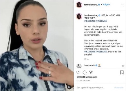 Afbeelding 1. Influencer Famke Louise kondigt aan zich niet langer aan de coronaregels te houden met de hashtag #ikdoenietmeermee